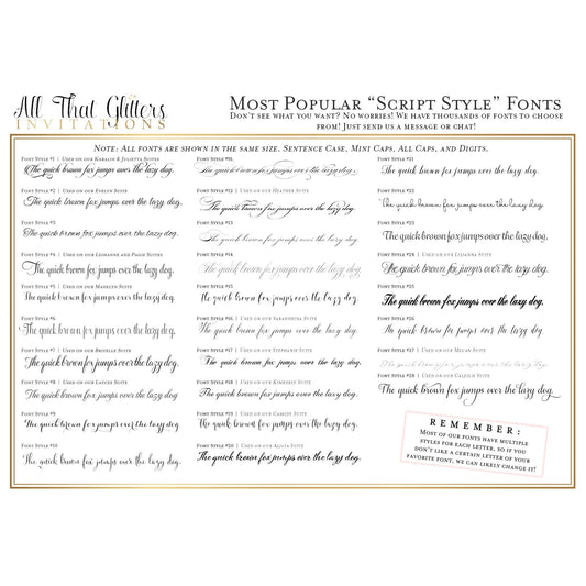 Shoot us a quick email at orders@allthatglittersinvitations.com or live chat with us right now